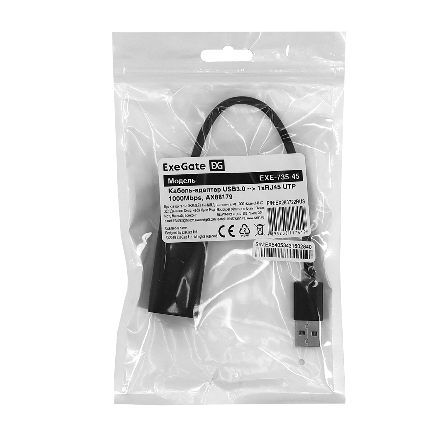Адаптер USB на RJ-45, ExeGate EXE-735-45, USB NIC 10/100/1000 Mb, LAN