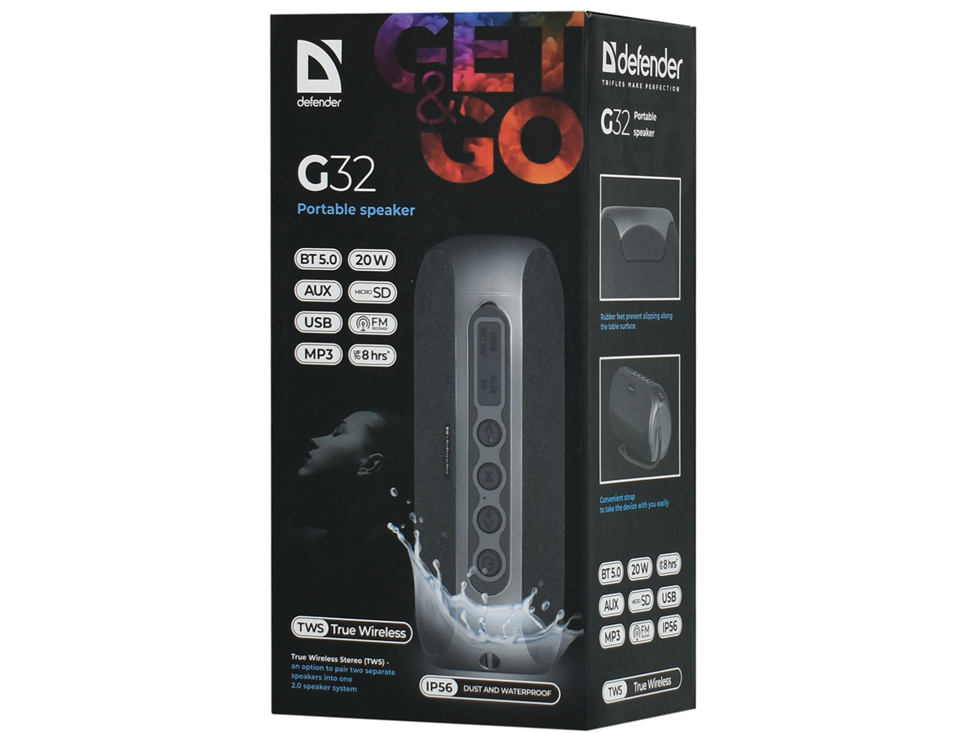 Акустическая система Defender G32, Черный Bluetooth SPK active 20W*1, 1800mAh, BT 5.0/FM/microSD/USB/AUX, black (65232)