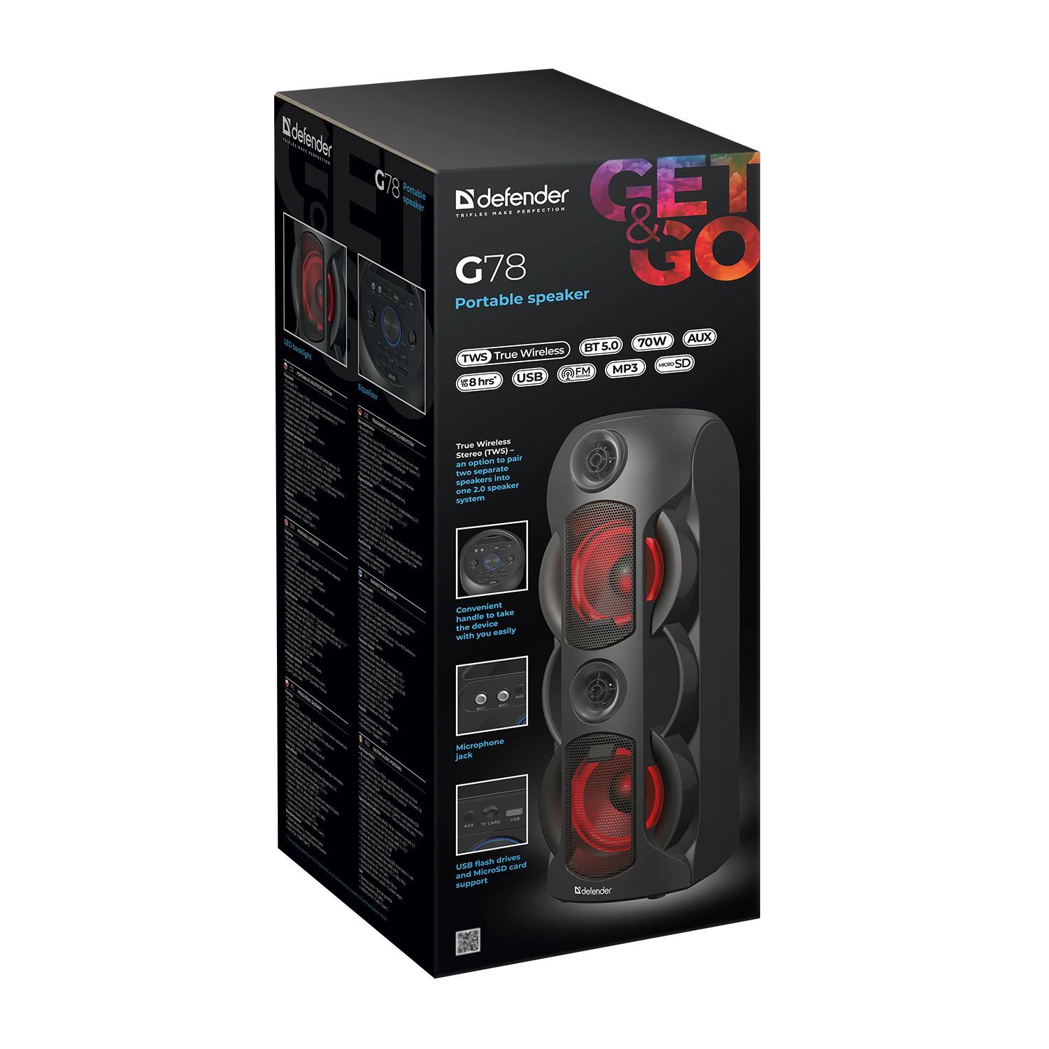 Акустическая система Defender G78, Черный Bluetooth SPK active 70W*1, 1800mAh, BT 5.0/FM/microSD/USB/AUX, black (65178)