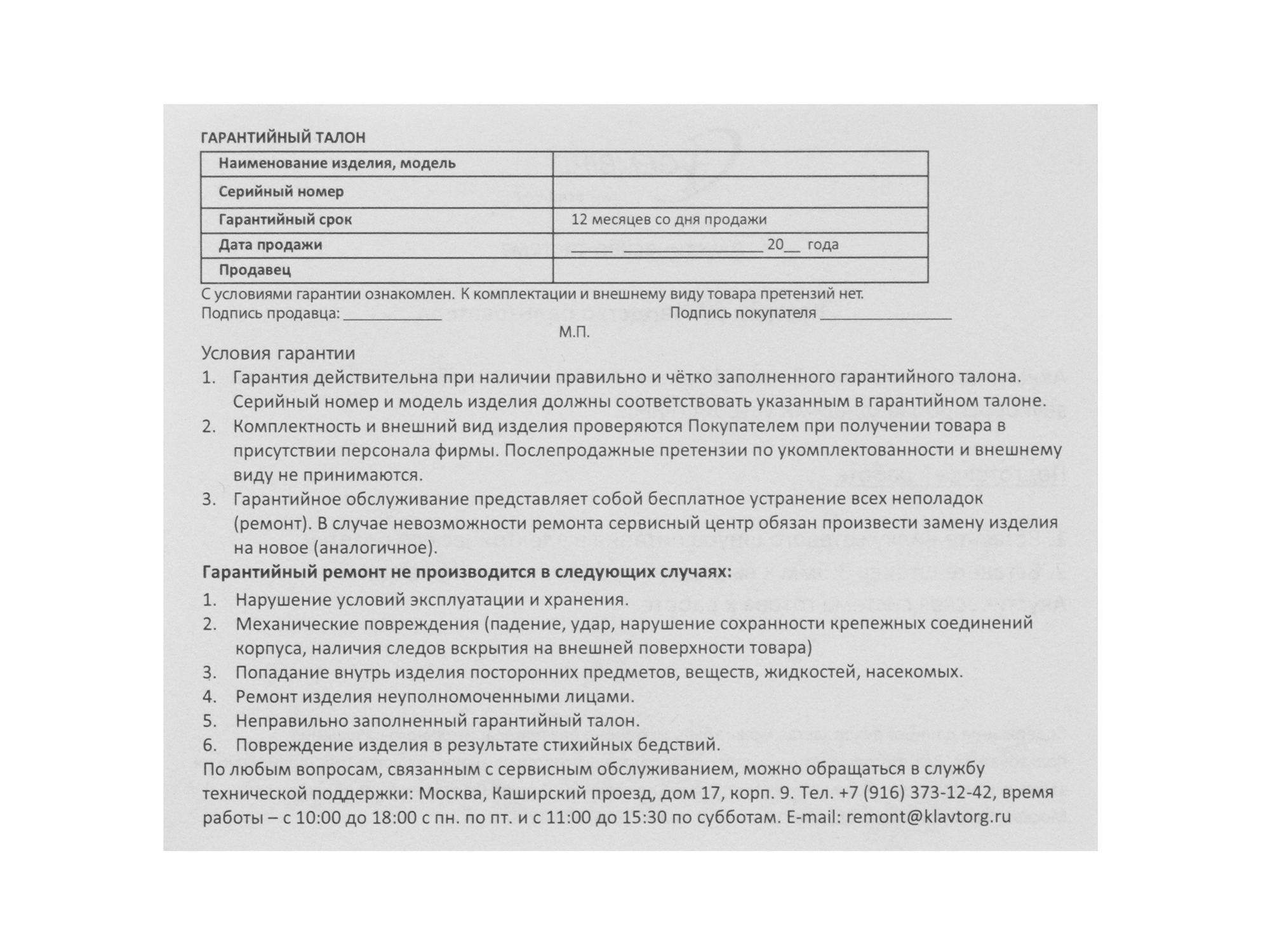 Гарантия: 1 год