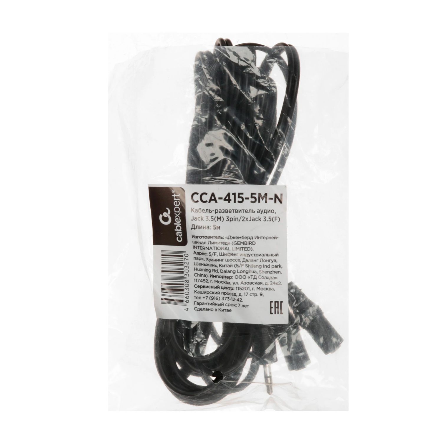 Аудиокабель Cablexpert CCA-415-5M-N, Черный Cable Audio, 3.5mm/m - 2x3.5mm/f, 5m, black