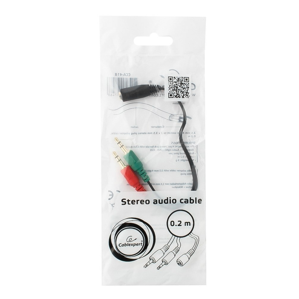 Аудиокабель Cablexpert CCA-418, Черный Cable Audio, 2X3.5mm/m - 3.5mm/f, audio + mic -> 4 pin, 0.2m, black