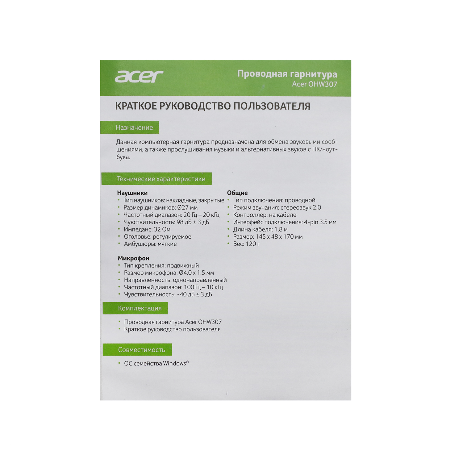 Гарнитура Acer OHW307, Черный Garnitura 32 Ohm, 20-20000Hz, 96dB, 1.8m cable, black
