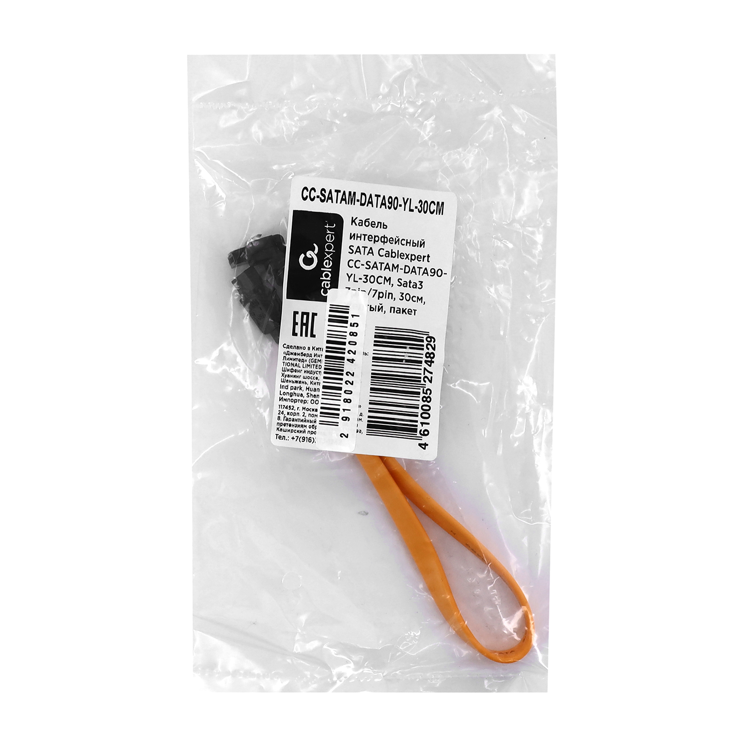 Кабель SATA, Cablexpert CC-SATAM-DATA90-YL-30CM Cable internal, data, угловой разъем