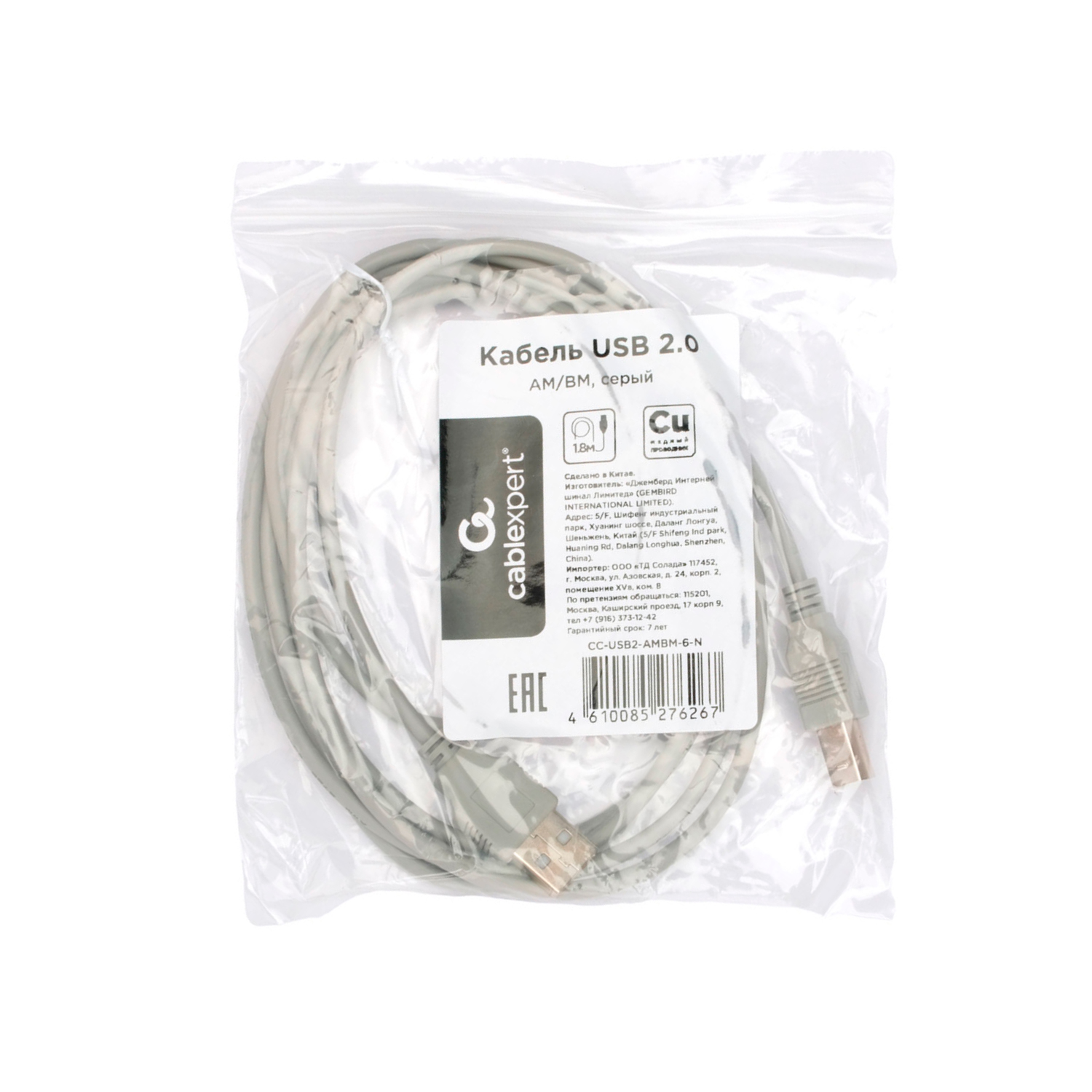 Кабель USB, Cablexpert CC-USB2-AMBM-6-N, 1.8M Cable Type A-B, 1.8м, USB2.0