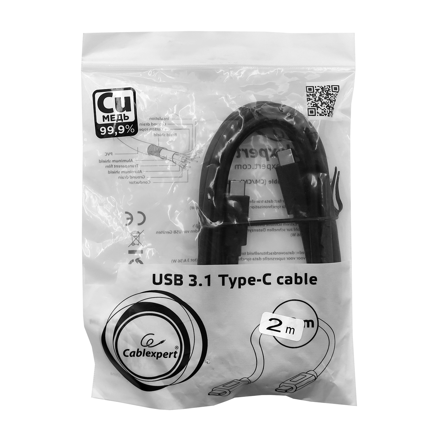 Кабель USB, Cablexpert CCP-USB3.1-CMCM-2M, 2м Cable Type C - Type C, USB 3.1, PD/QC3.0, 3A/36W, black