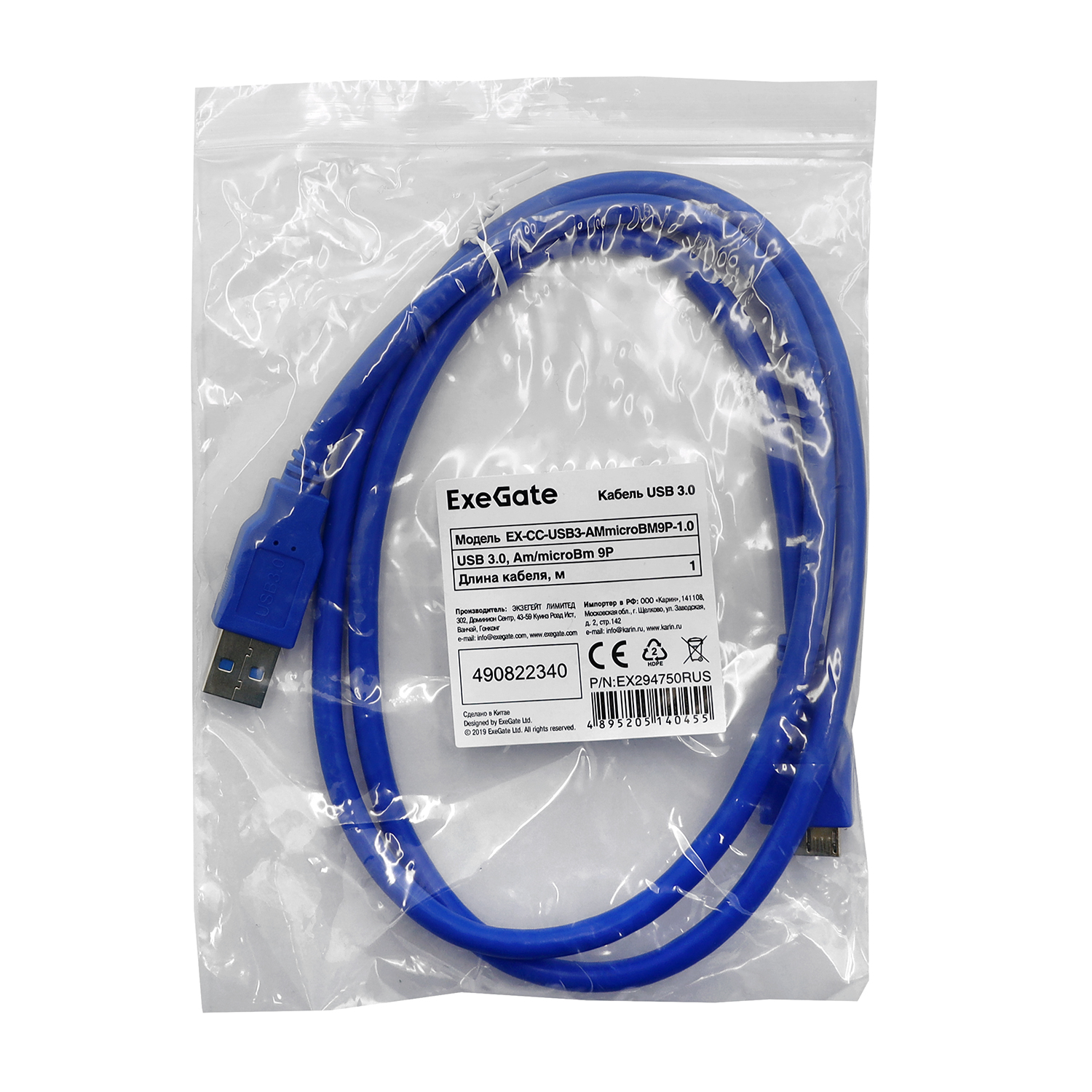 Кабель USB, ExeGate EX-CC-USB3-AMmicroBM9P-1.0, 1.0м Cable Type A - micro B, USB 3.0