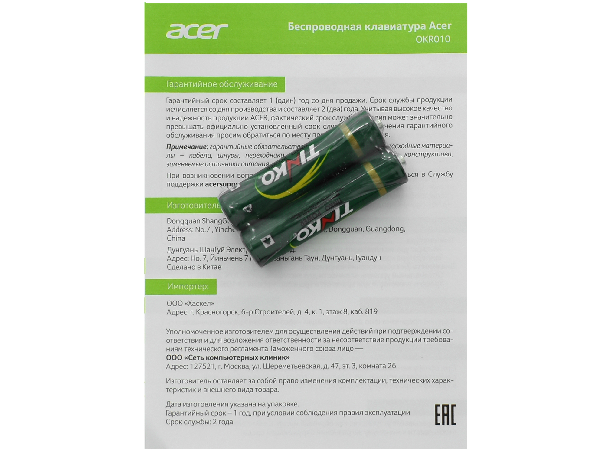 Клавиатура Acer OKR010, Черный KeyBoard USB, Wireless, 103+6 buttons, rus/lat, black