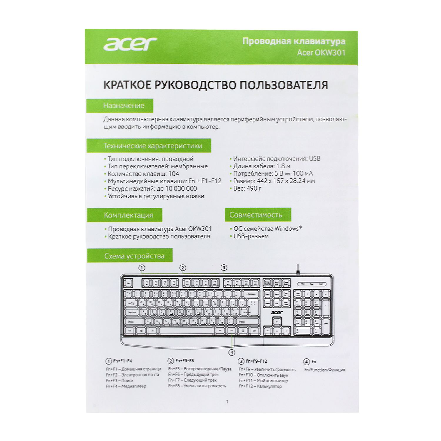 Клавиатура USB, Acer OKW301, Черный KeyBoard 104 buttons, rus/lat, Black