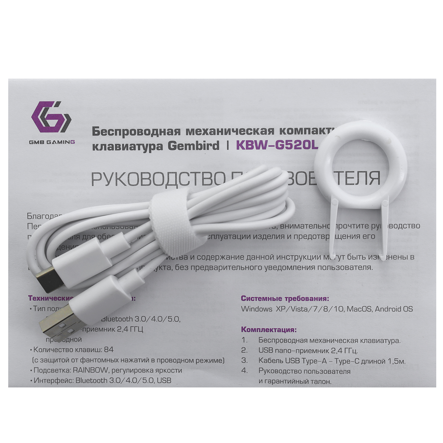 Клавиатура USB, Gembird KBW-G520L, Белый KeyBoard BT/2.4 GHz wireless,1.5m cable, USB white