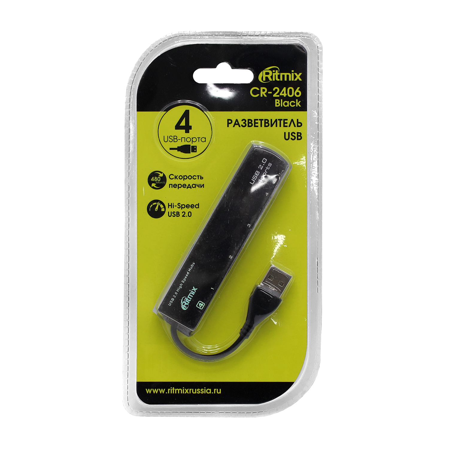 Концентратор USB 2.0 Ritmix CR-2406, Черный USB Hub 4 port, mirror, black