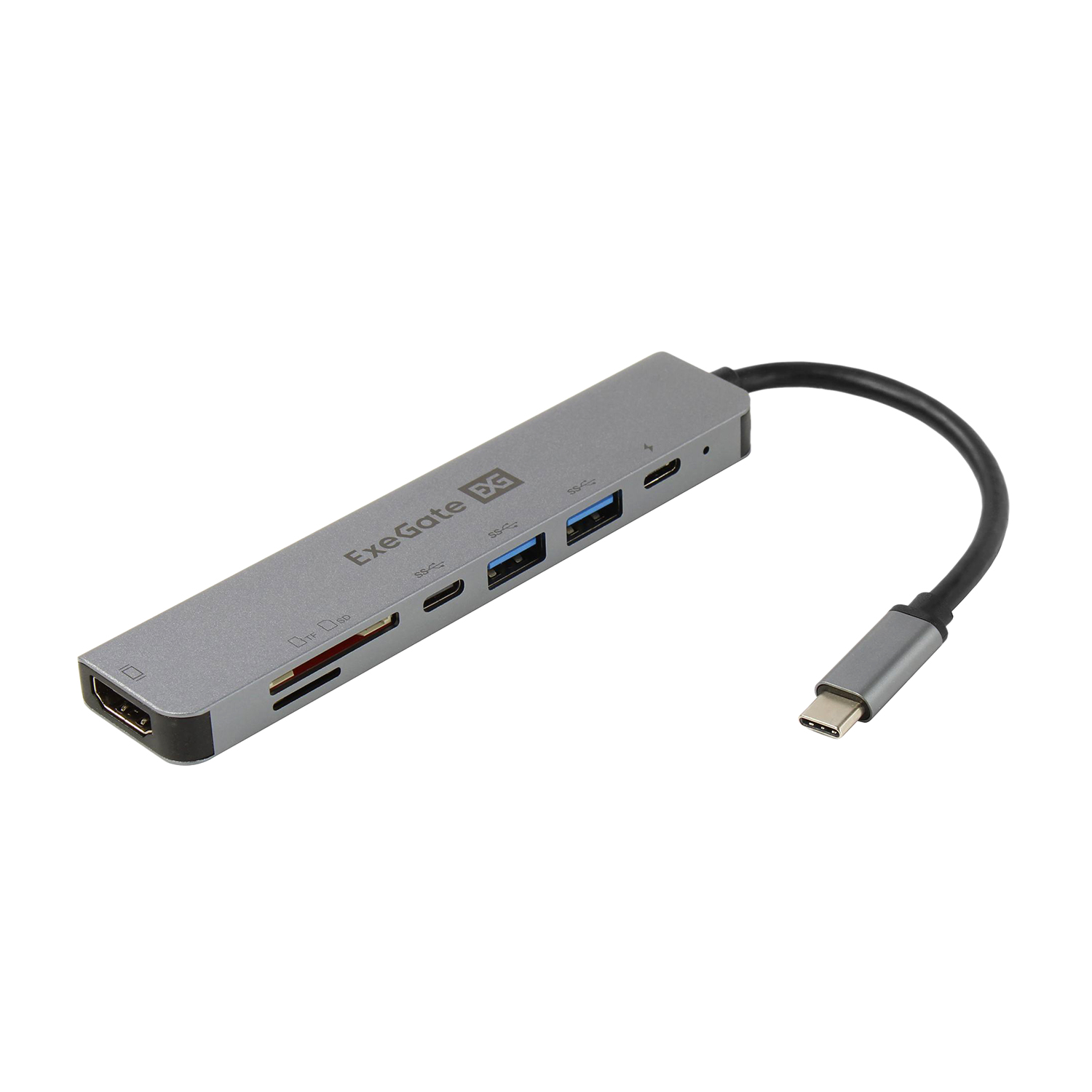 Концентратор USB ExeGate DUB-21C/PD/CR/H, EX293983RUS, Серый Hub 7 port, USB Type-C/2xType-A/HDMI/SD/microSD, grey