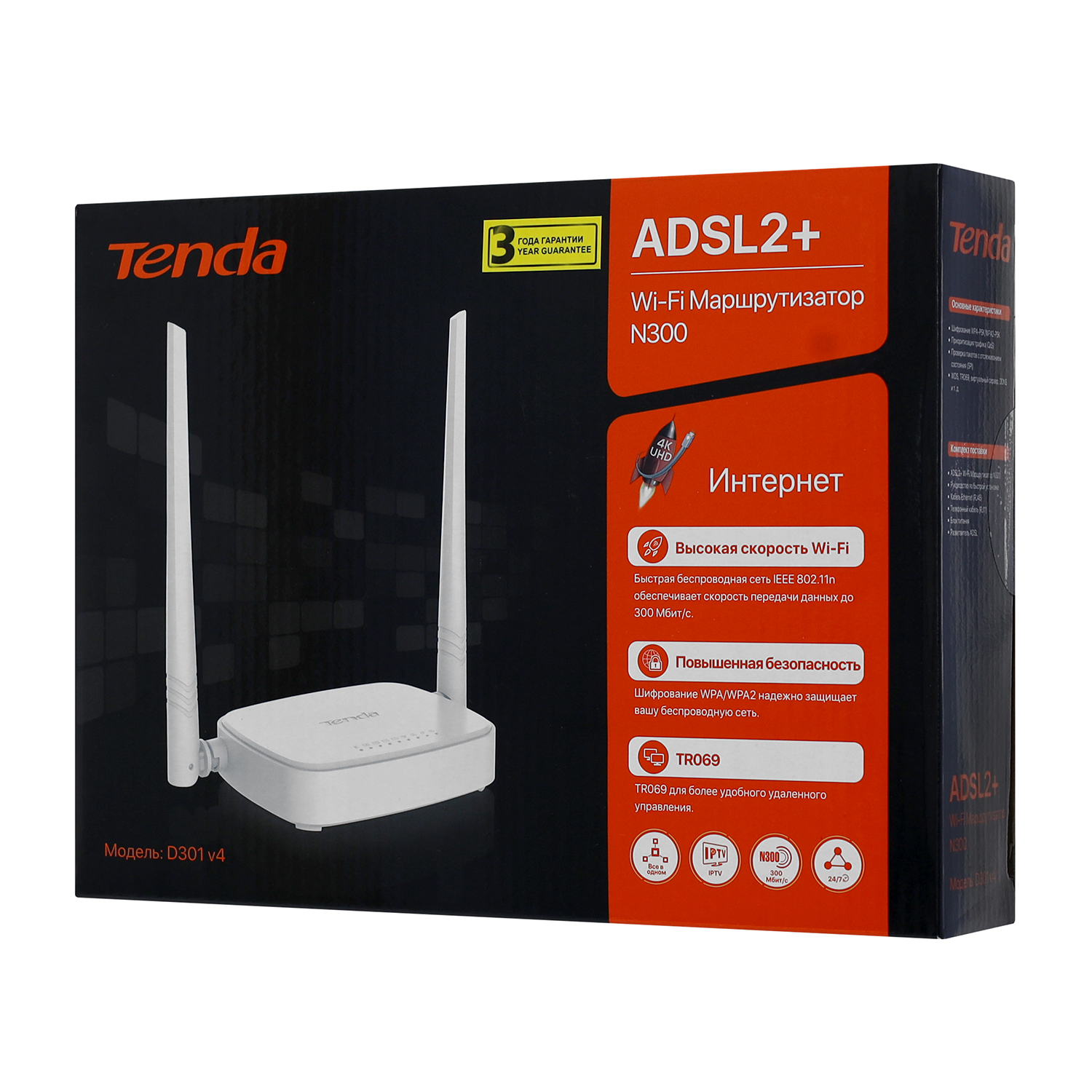 Маршрутизатор ADSL Tenda D301 v4 Modem/Router, USB, 4x10/100M, ADSL2+, Wi-Fi 4 (300M)