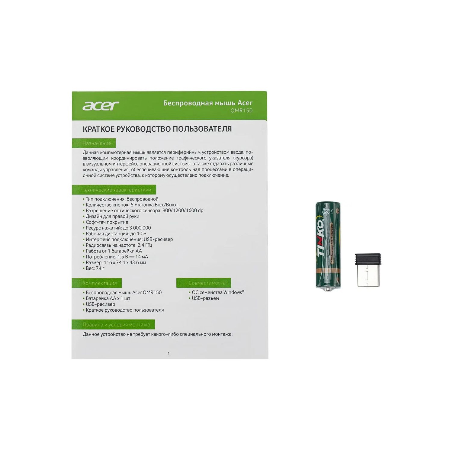 Mouse Acer OMR150, Wireless, Optical 1600 dpi, 1AA, USB, black