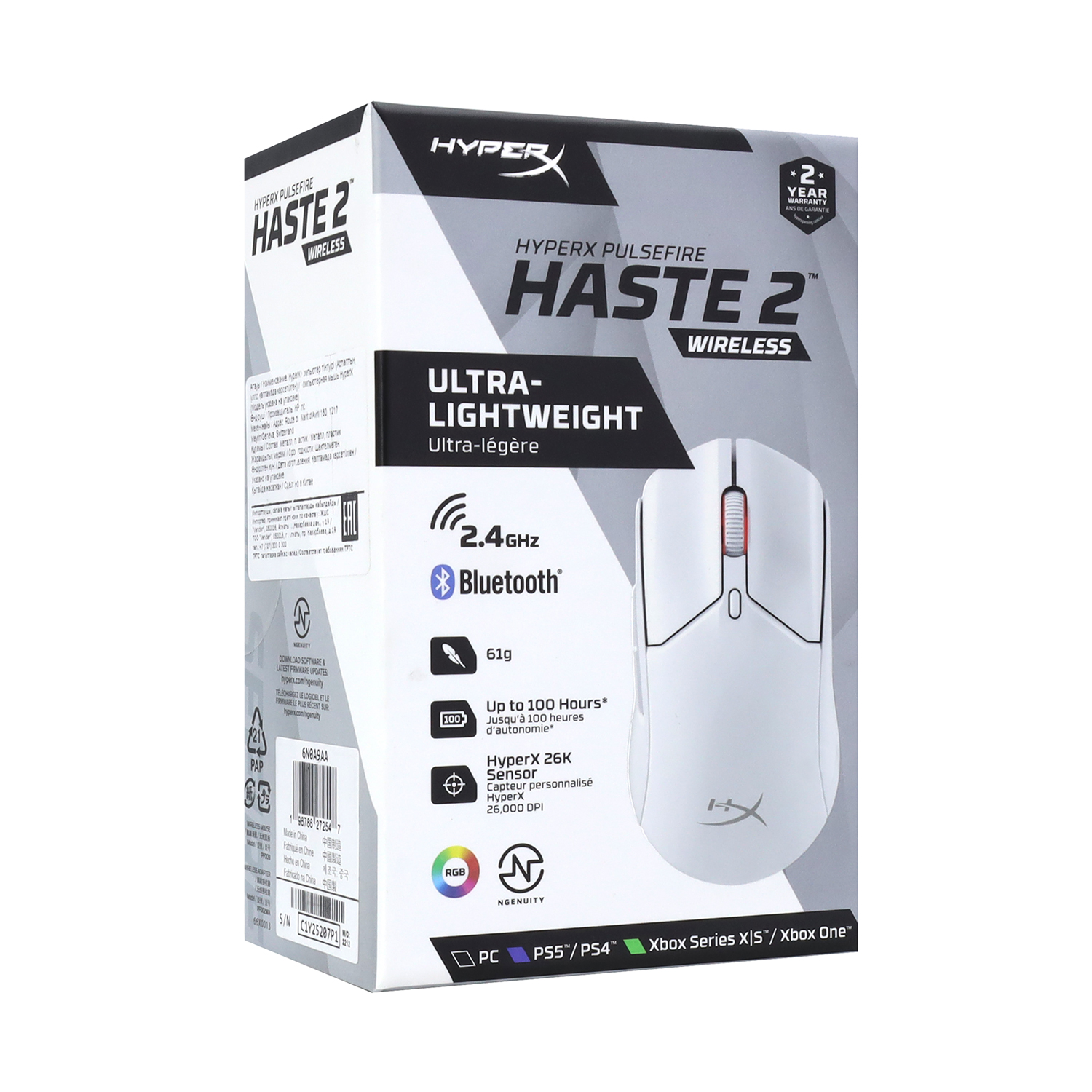 Мышь HyperX Pulsefire Haste 2, USB Mouse Wireless, (6N0A9AA), Optical, 26000dpi, BT/2.4GHz, white
