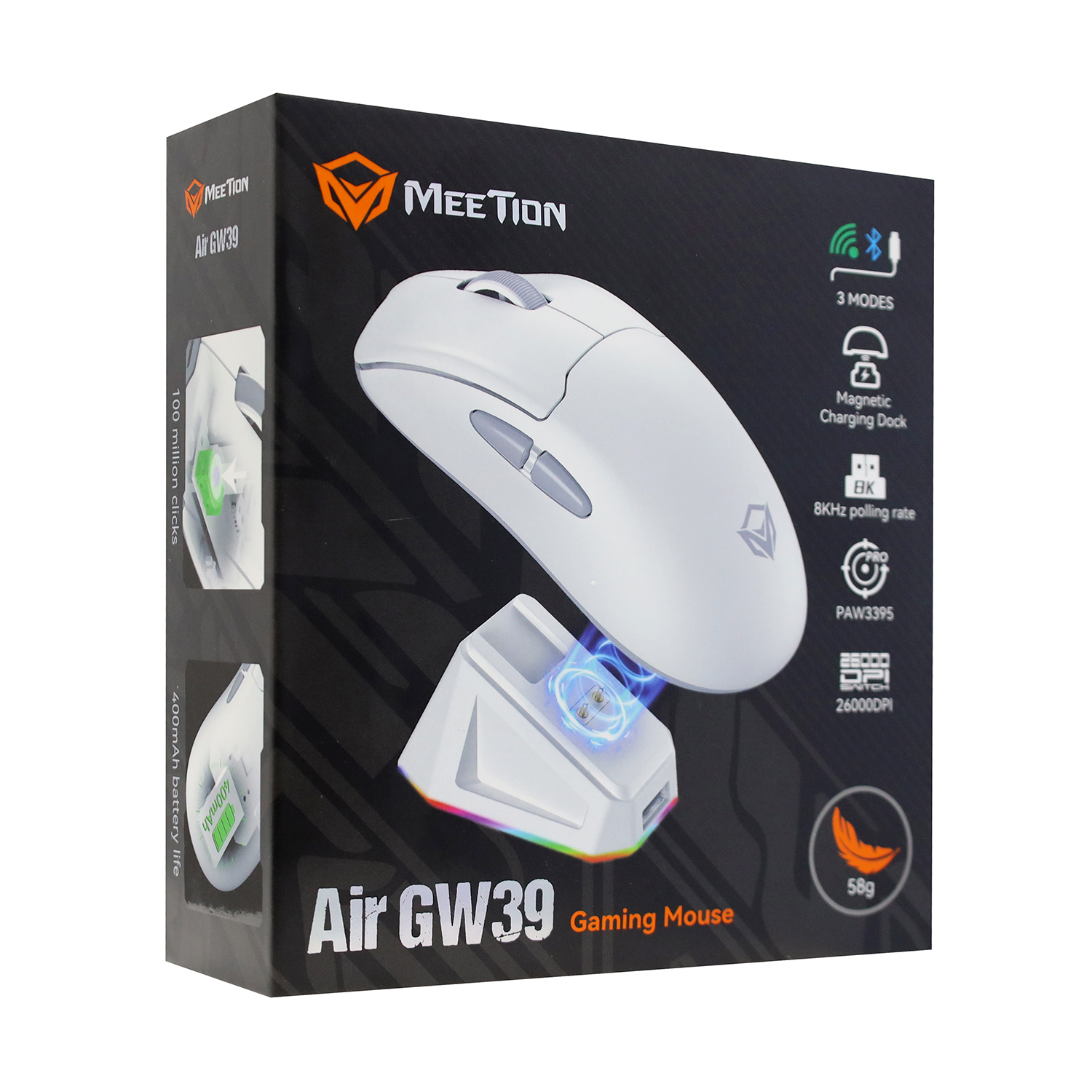 Мышь Meetion AIR GW39, Белый+Серый Mouse Wireless, PAW3395, 26000DPI, 400mAh, 5 Button, USB-C, 2.4 GHz/BT, WE+Grey