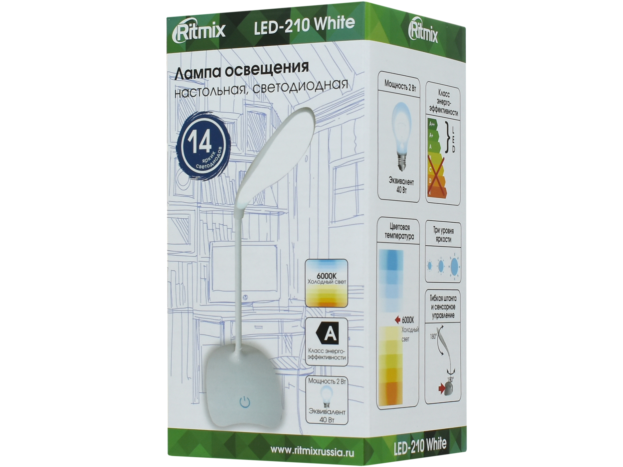 Настольная лампа, Ritmix LED-210 White USB LED light, 14 LED, USB power, настольная