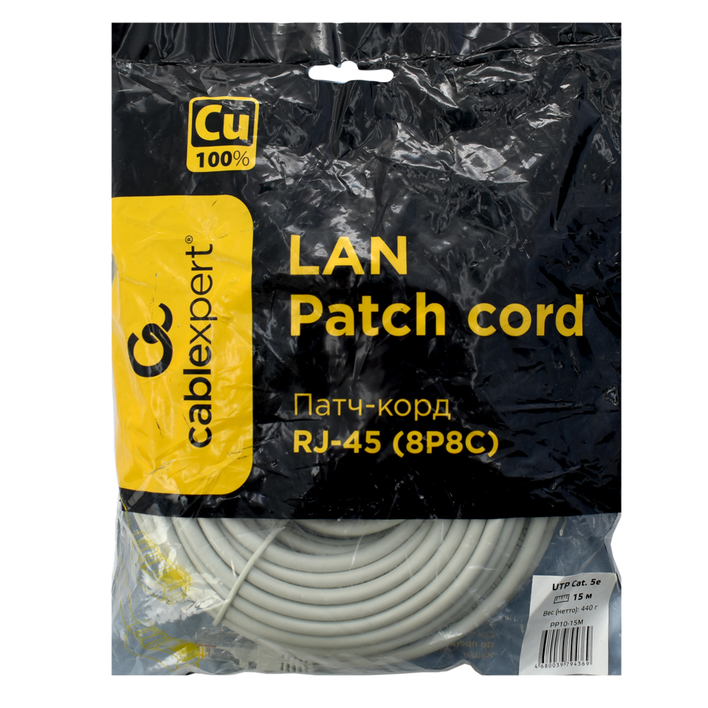 Патч-корд Cablexpert PP10-15M, серый Cable Patch cord UTP 5e-Cat 15 m