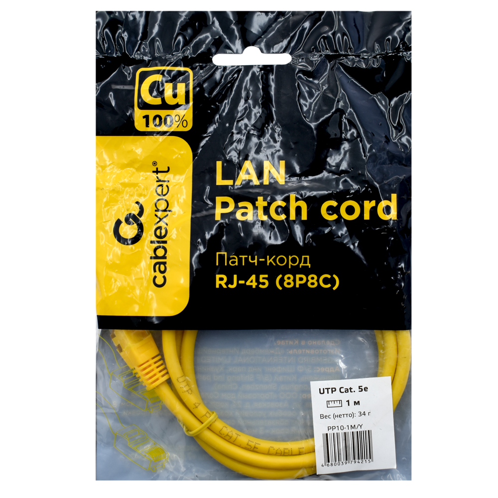 Патч-корд Cablexpert PP10-1M/Y, желтый Cable Patch cord UTP 5e-Cat 1 m