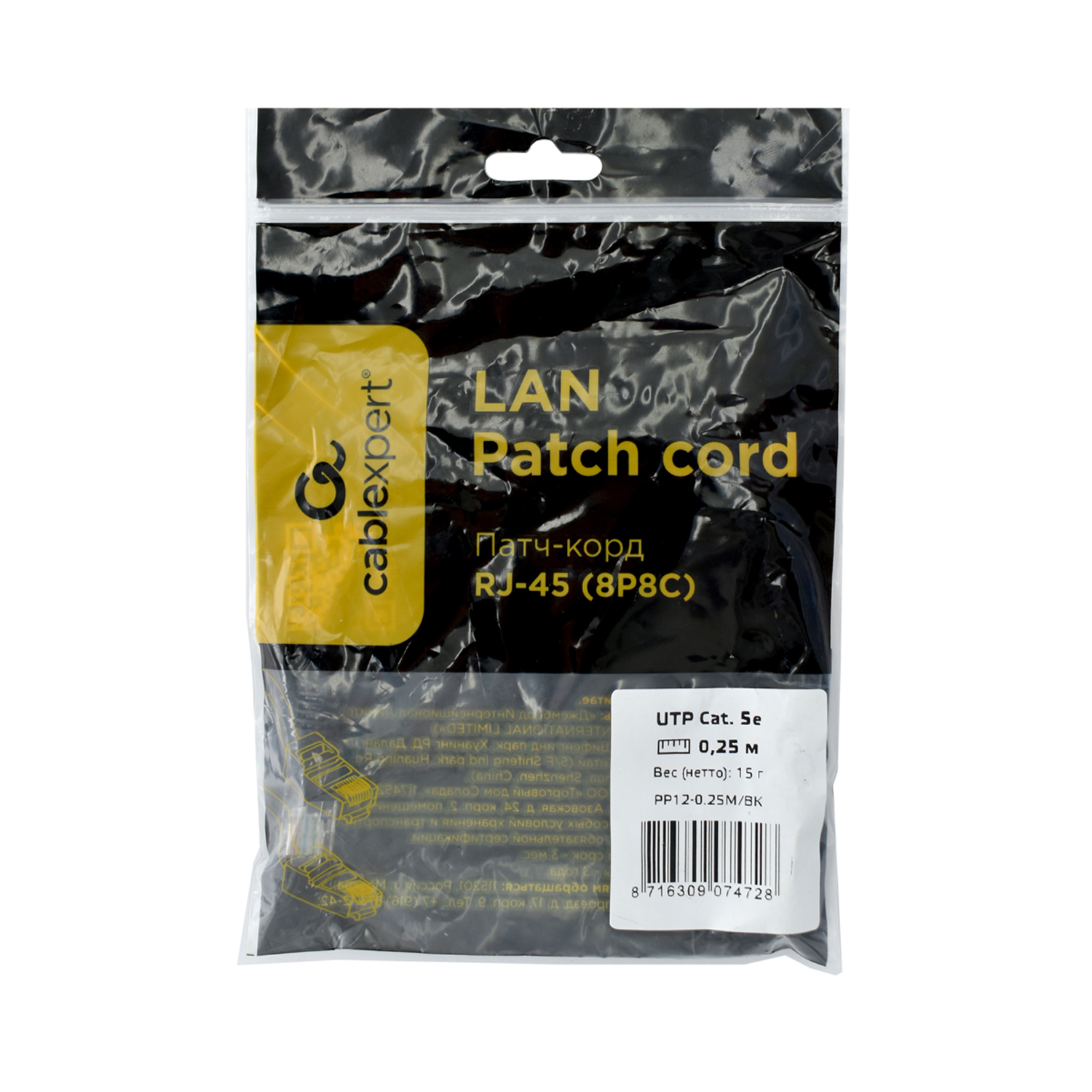 Патч-корд Cablexpert PP12-0.25M/BK, черный Cable Patch cord UTP 5e-Cat 0.25 m