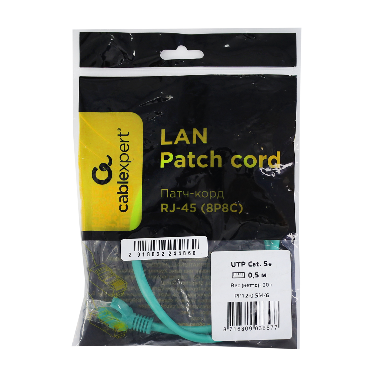 Патч-корд Cablexpert PP12-0.5M/G, зеленый Cable Patch cord UTP 5e-Cat 0.5 m