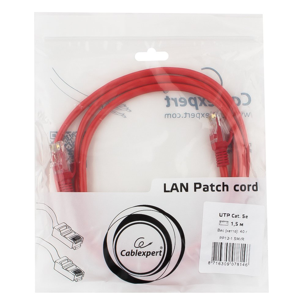 Патч-корд Cablexpert PP12-1.5M/R, красный Cable Patch cord UTP 5e-Cat 1.5 m