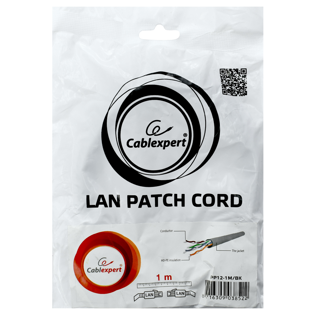 Патч-корд Cablexpert PP12-1M/BK, черный Cable Patch cord UTP 5e-Cat 1 m