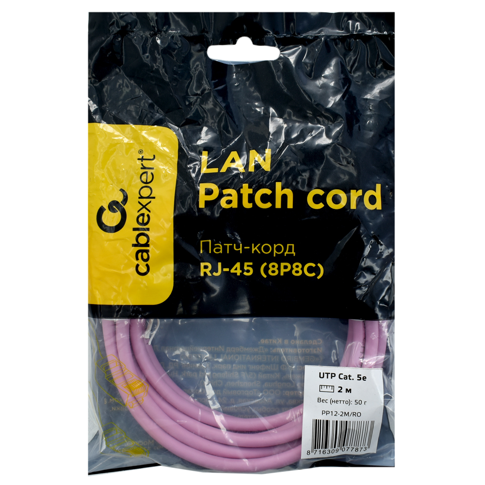 Патч-корд Cablexpert PP12-2M/RO, розовый Cable Patch cord UTP 5e-Cat 2 m