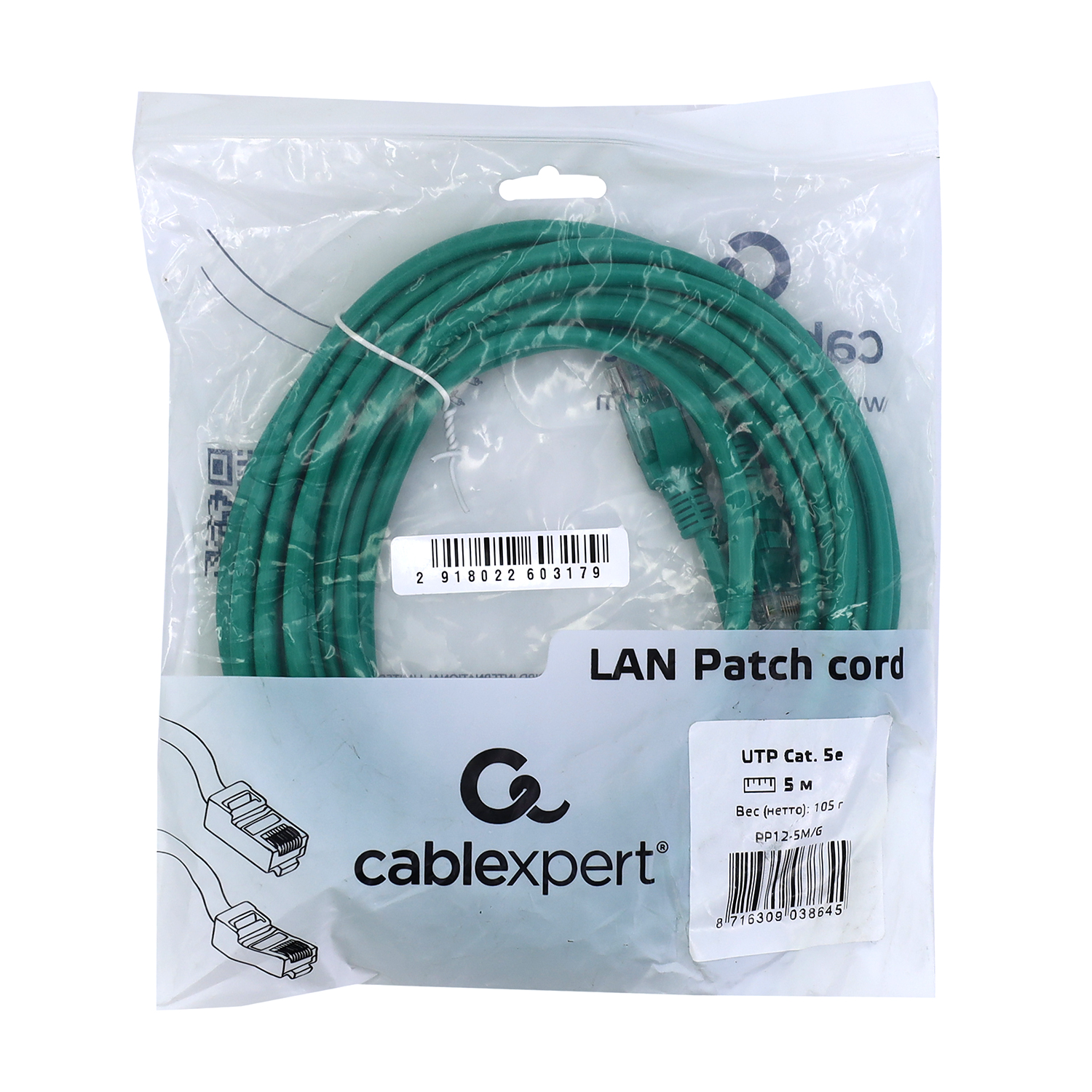 Патч-корд Cablexpert PP12-5M/G, зеленый Cable Patch cord UTP 5e-Cat 5 m