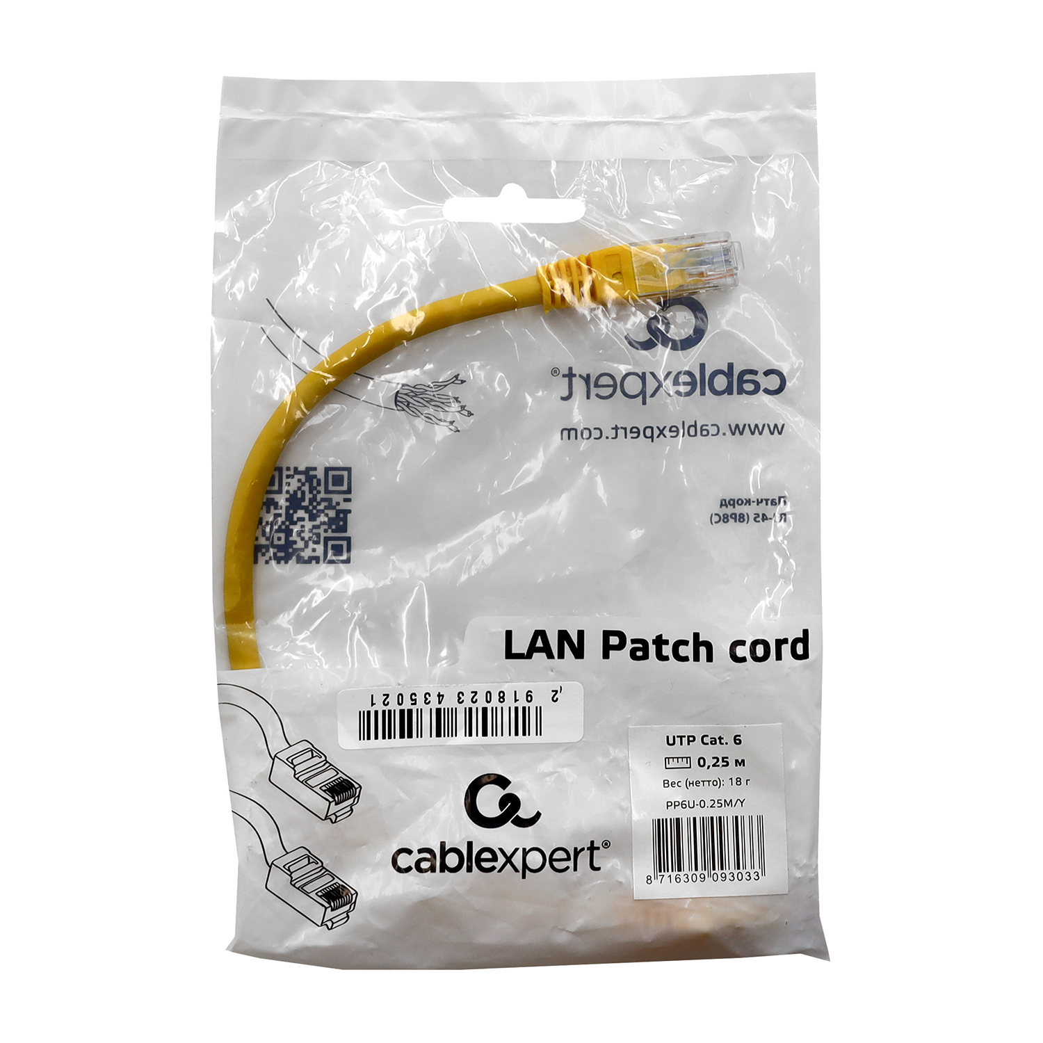 Патч-корд Cablexpert PP6U-0.25M/Y, жёлтый Cable Patch cord UTP 6-Cat 0.25 m