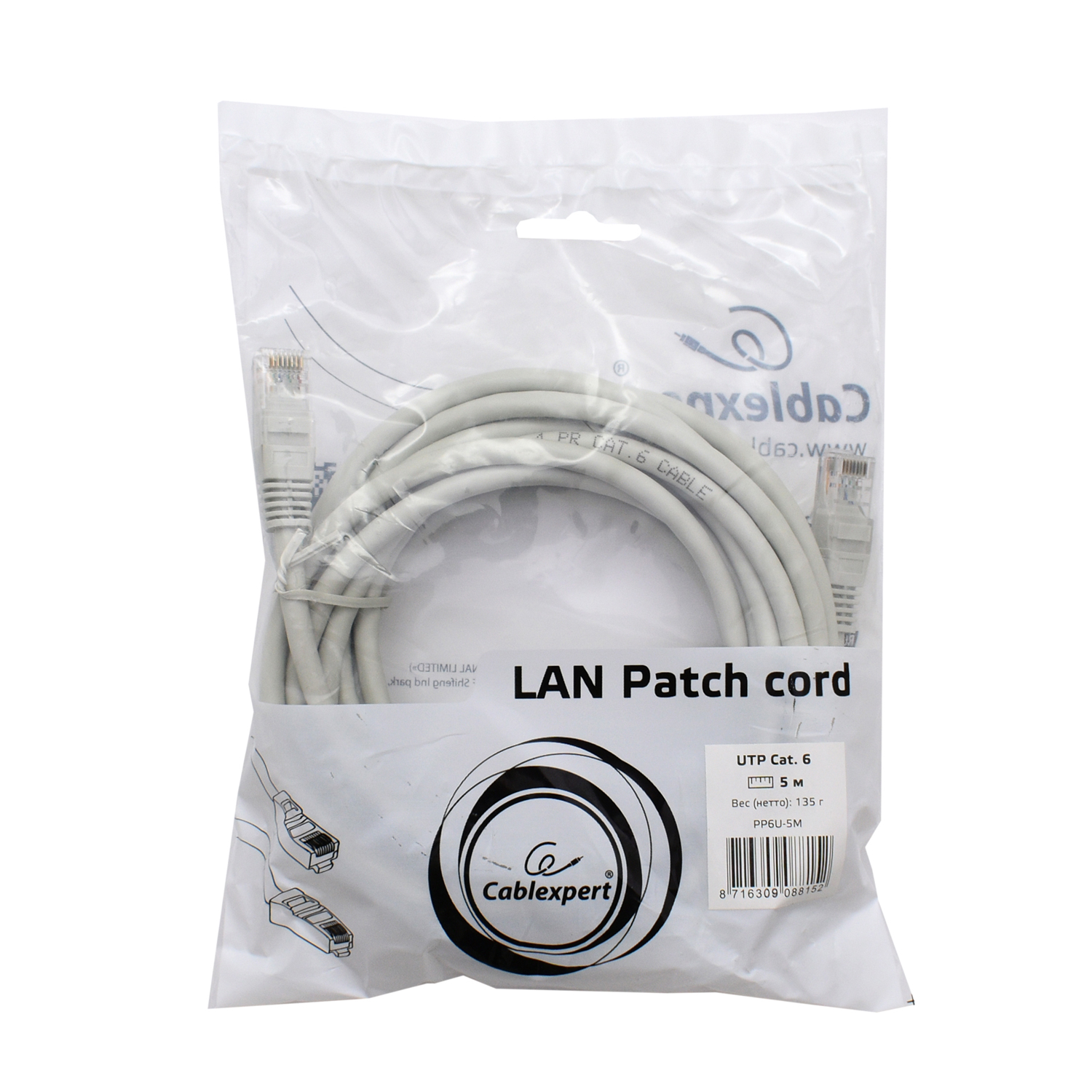 Патч-корд Cablexpert PP6U-5M, серый Cable Patch cord UTP 6e-Cat 5 m