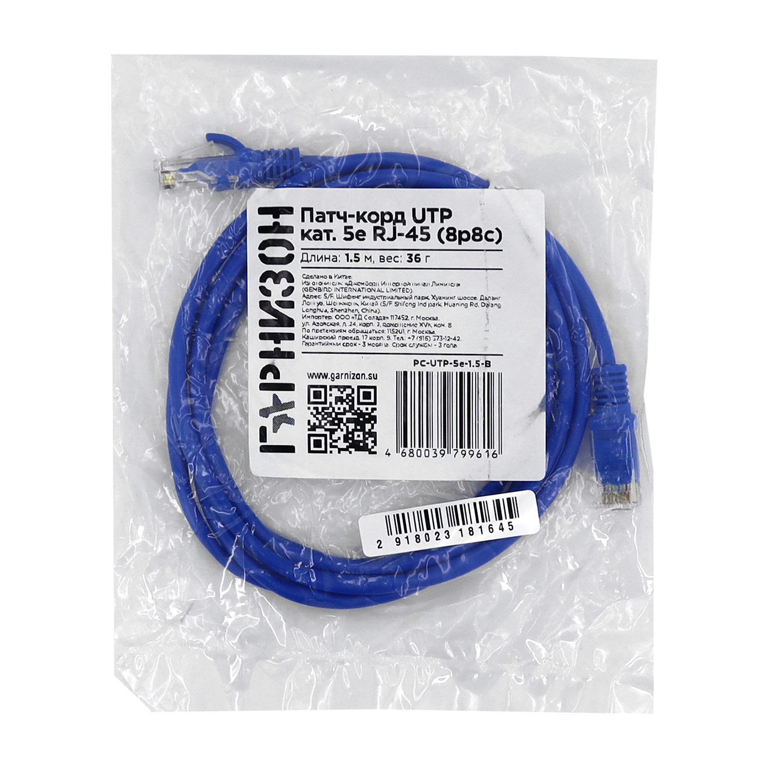 Cable Patch cord UTP 5e-Cat 1.5 m Гарнизон PC-UTP-5e-1.5-B, Blue
