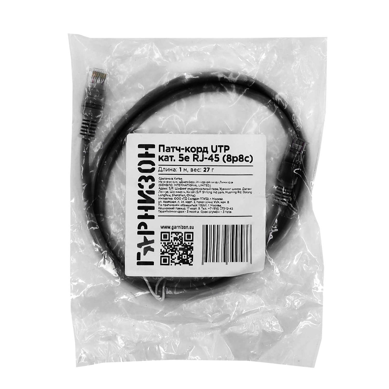 Патч-корд Гарнизон PC-UTP-5e-1-BK, Чёрный Cable Patch cord UTP 5e-Cat 1 m black