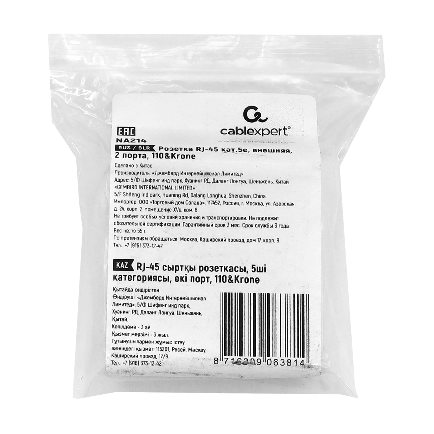 Розетка сетевая Cablexpert NA214 Net Socket RJ-45, 2 разъём