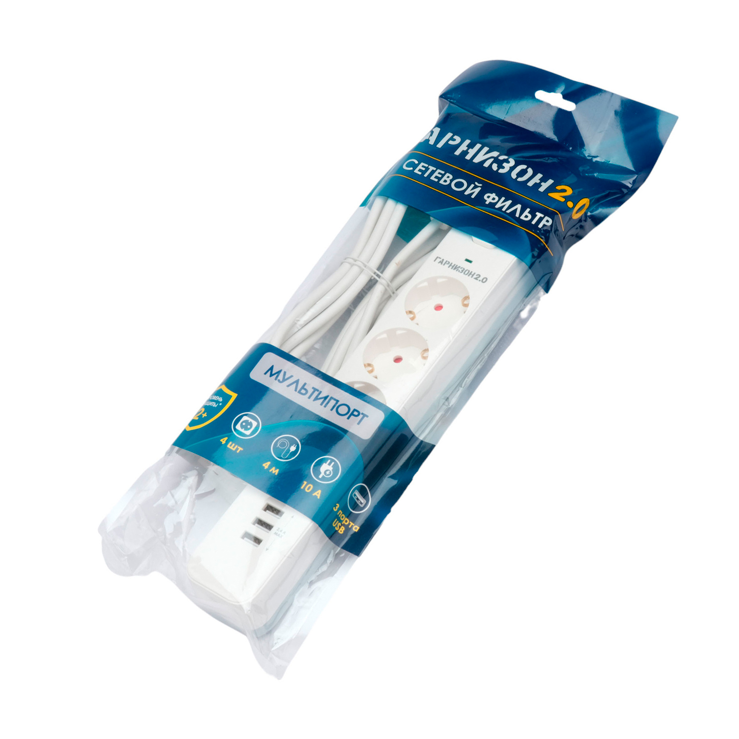 Сетевой фильтр Гарнизон, EPS-4-U3-W-4, 4м, Белый 4розеток, 3xUSB, 10A, white