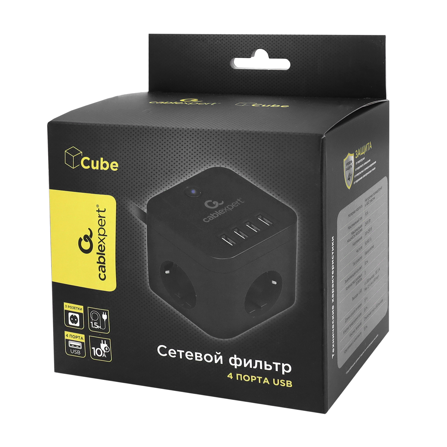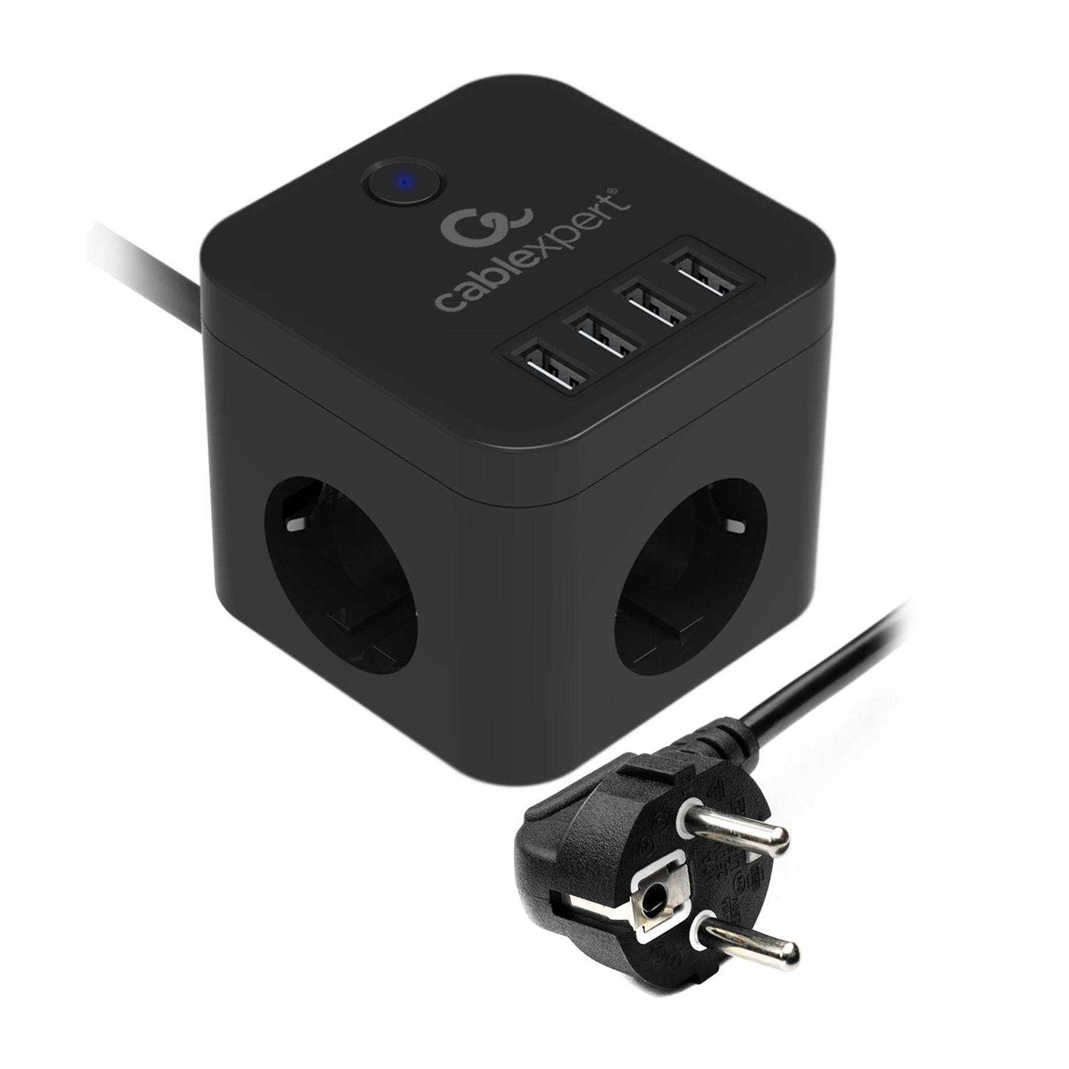 Сетевой фильтр + зарядка Cablexpert CUBE-3-U4-B-1.5, Черный 1.5m, 3 розетки, 10A, 4 USB, switch, Black