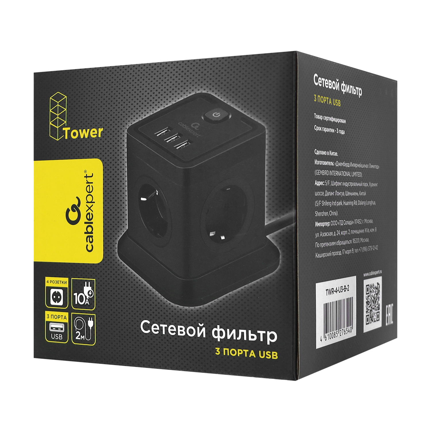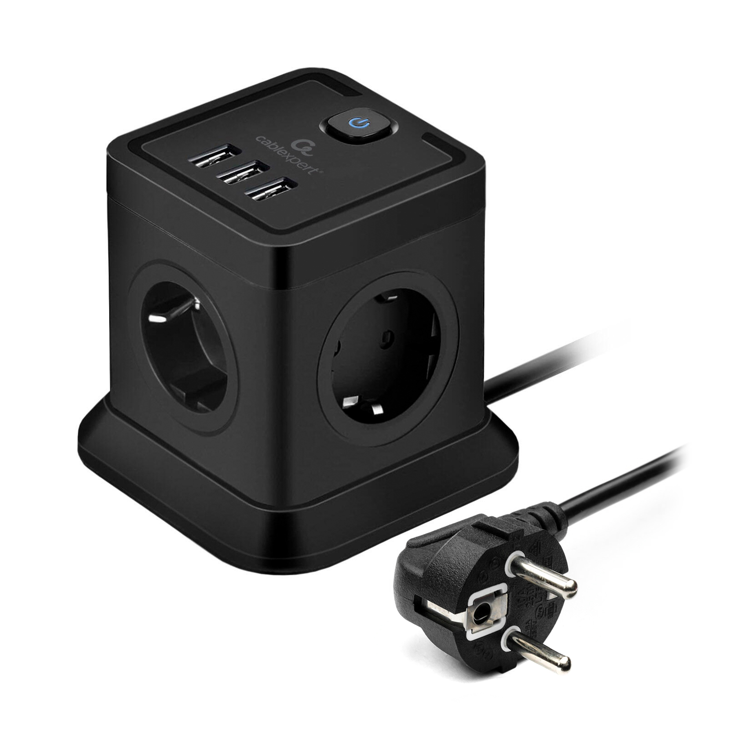 Сетевой фильтр + зарядка Cablexpert Tower TWR-4-U3-B-2, Черный 2m,3розетки, 10A, 3xUSB 3.1А, switch, Black
