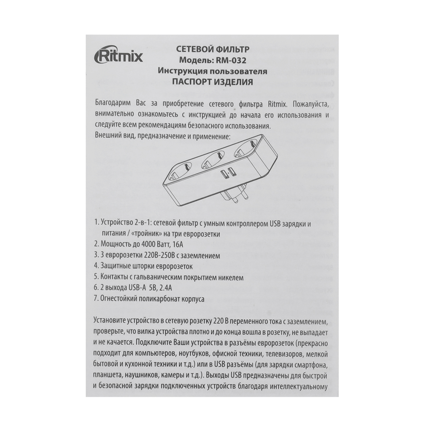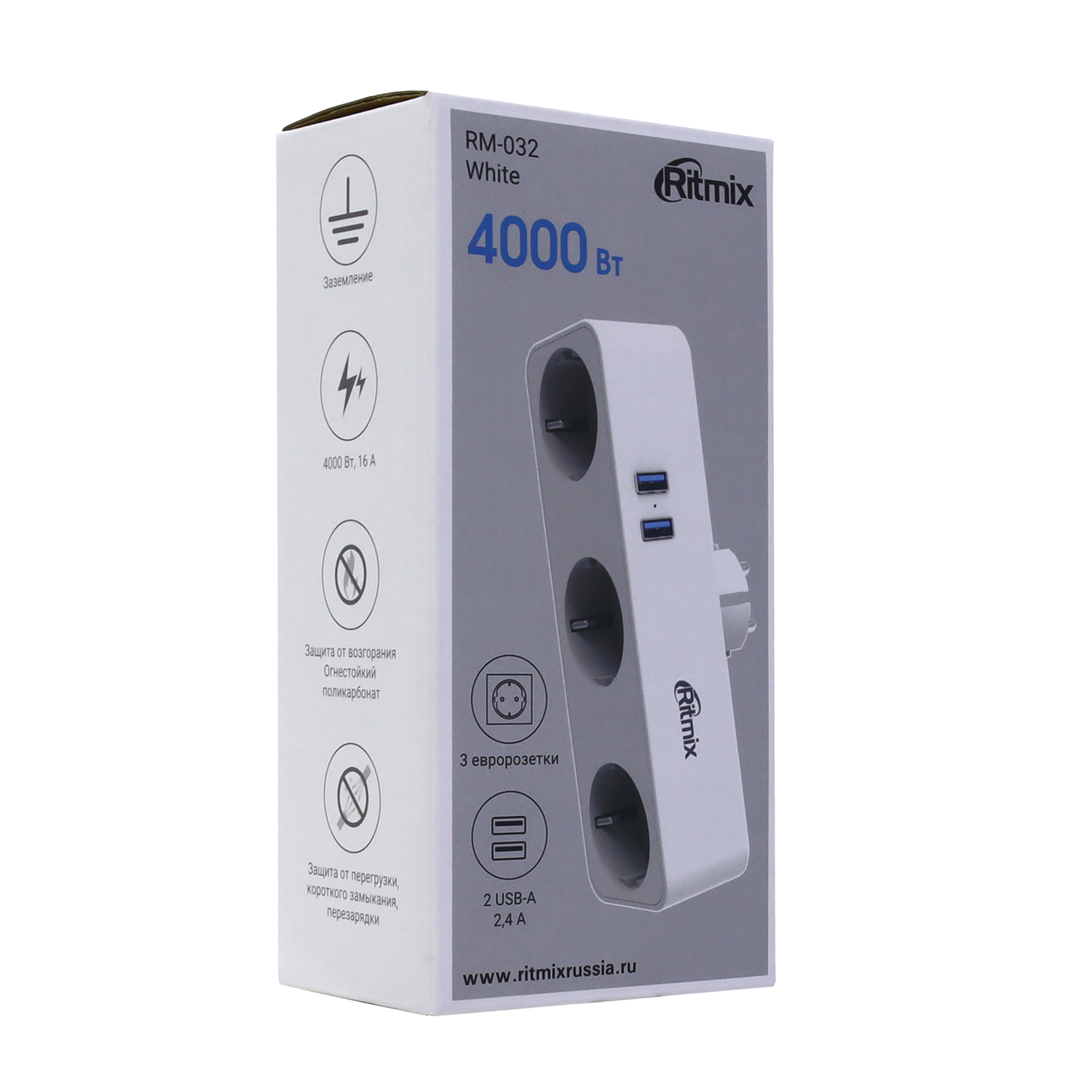 Сетевой фильтр + зарядка Ritmix RM-032, Белый