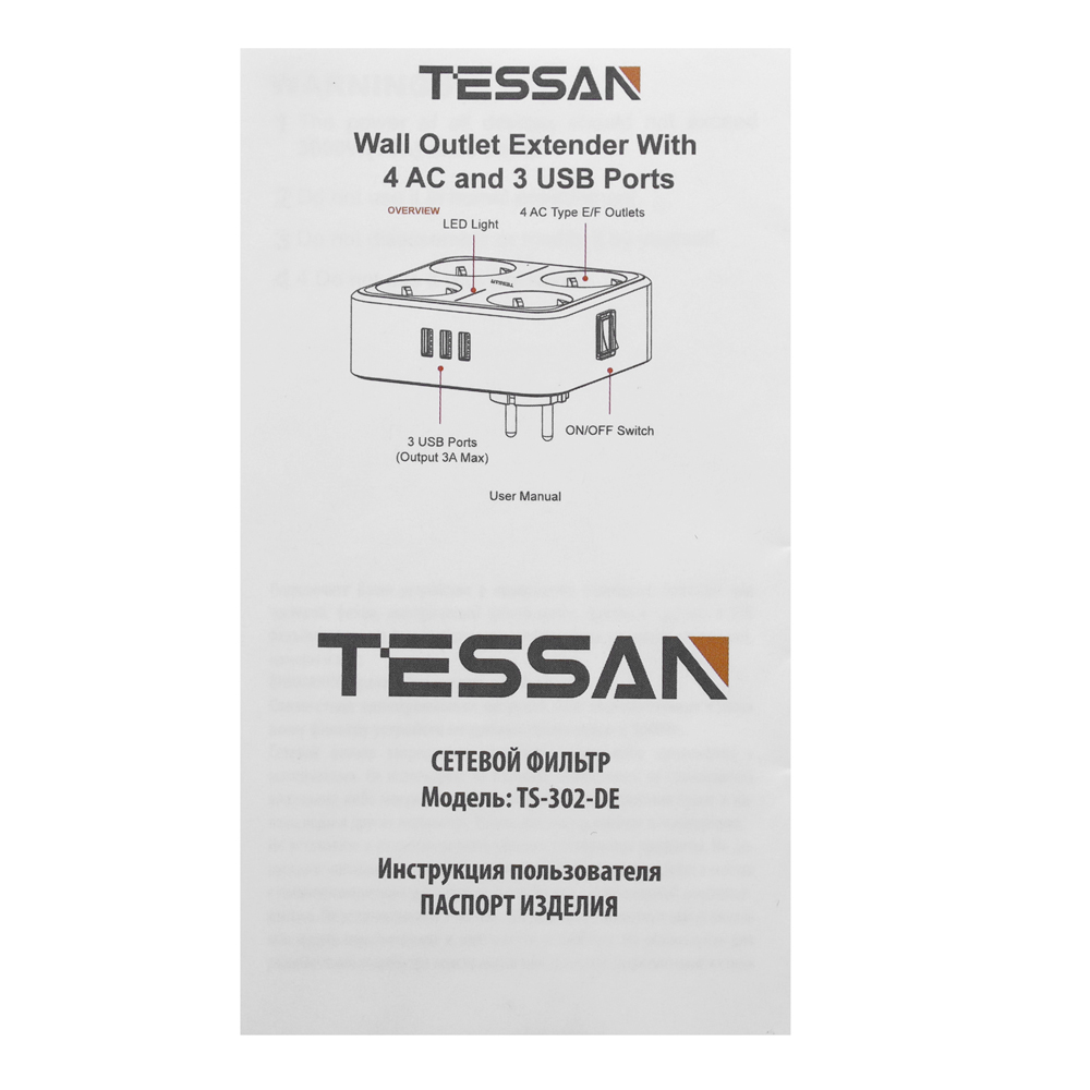 Сетевой фильтр + зарядка Tessan TS-302-DE, Серый