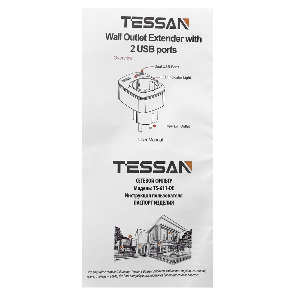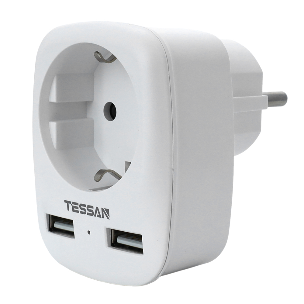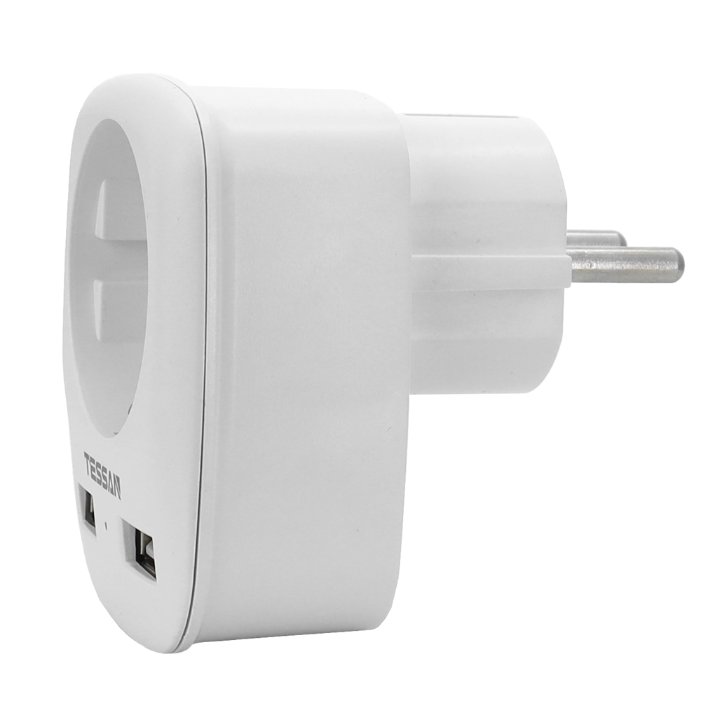 Сетевой фильтр + зарядка Tessan TS-611-DE, Белый 1 розетка, 16A, 2 USB 2.4A max, white