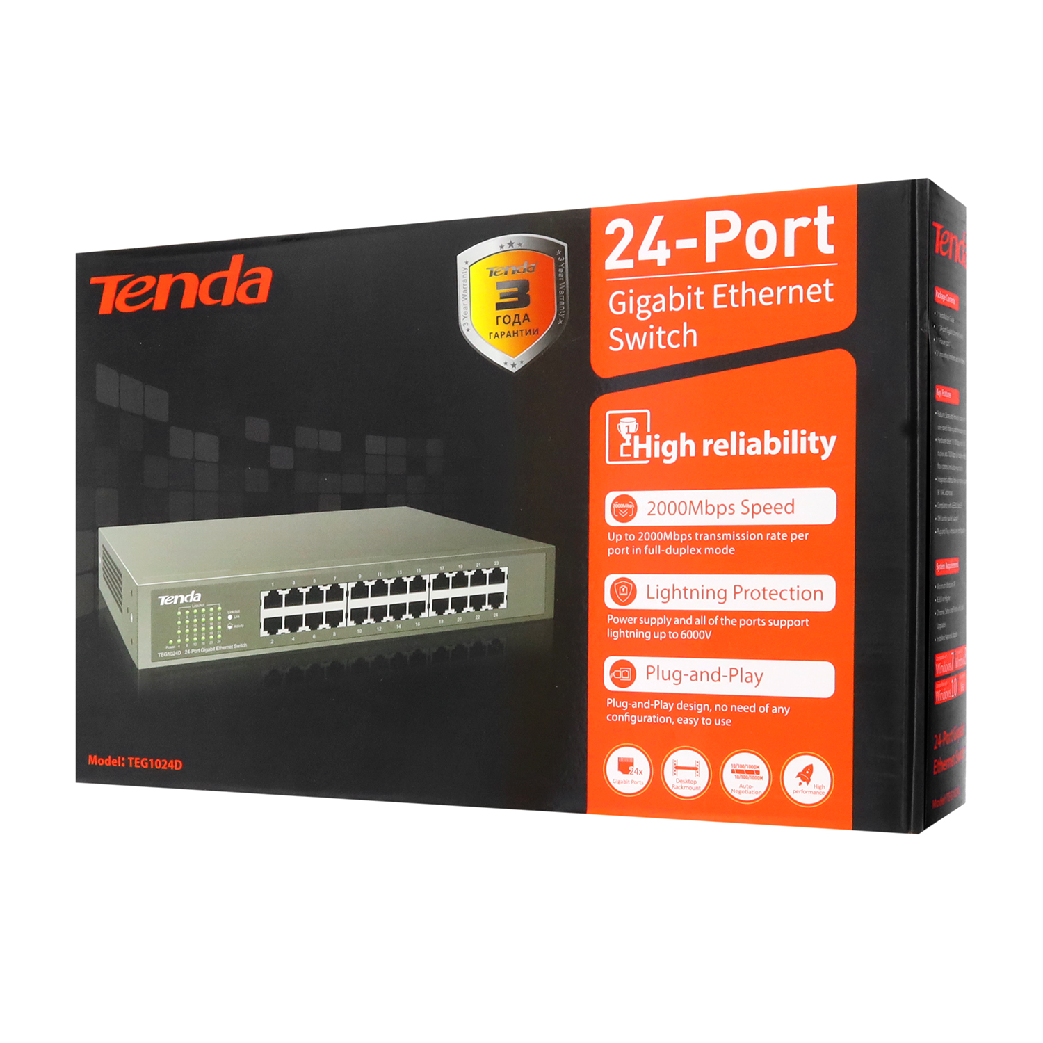 Сетевой коммутатор Tenda TEG1024D Switch 24 port 10/100/1000M, Auto MDI/MDI-X, rack/desktop, int. PS