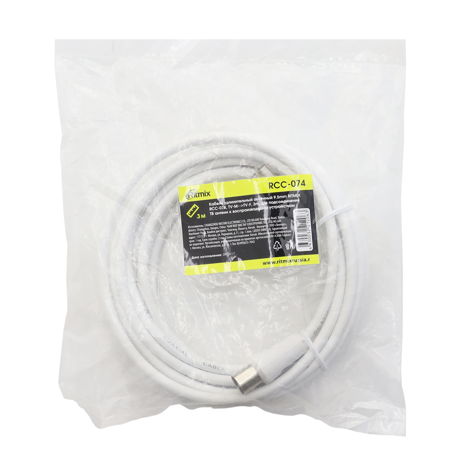 Удлинитель TV-m -> TV f, Ritmix RCC-074 Cable (удлинитель), coaxial, 3m, white