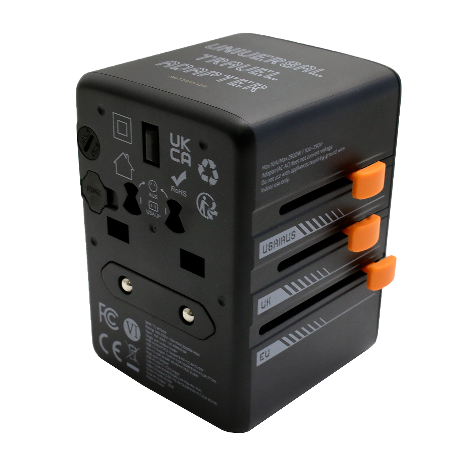 Универсальный адаптер + зарядка Tessan TS-WTA02, Чёрный 1 мультирозеткa 10A, 3USB-C + 2USB-A 35W max, black