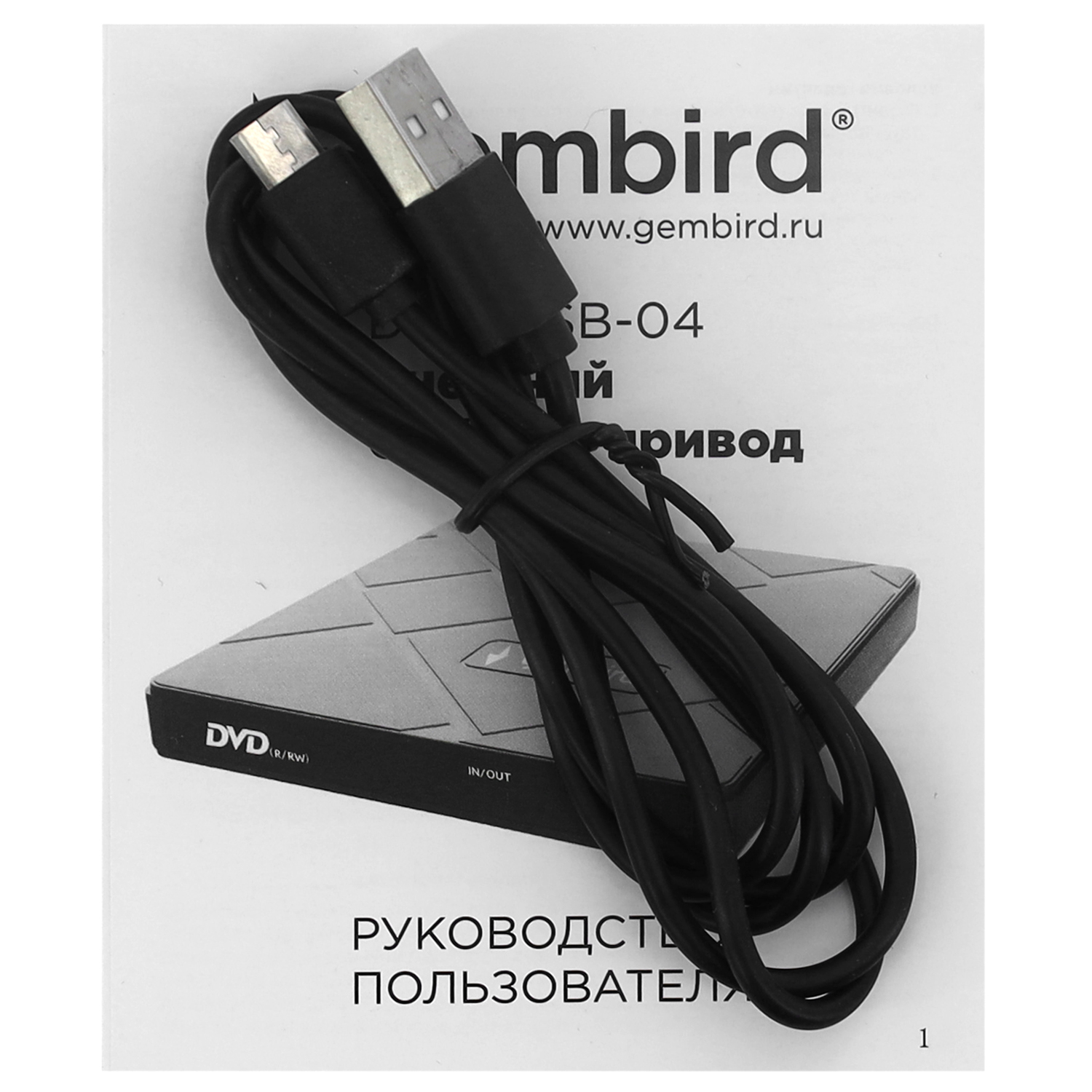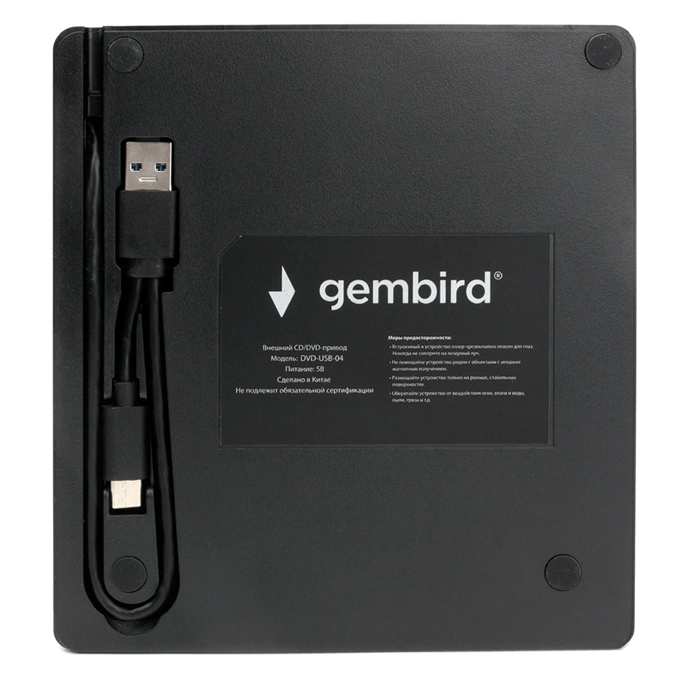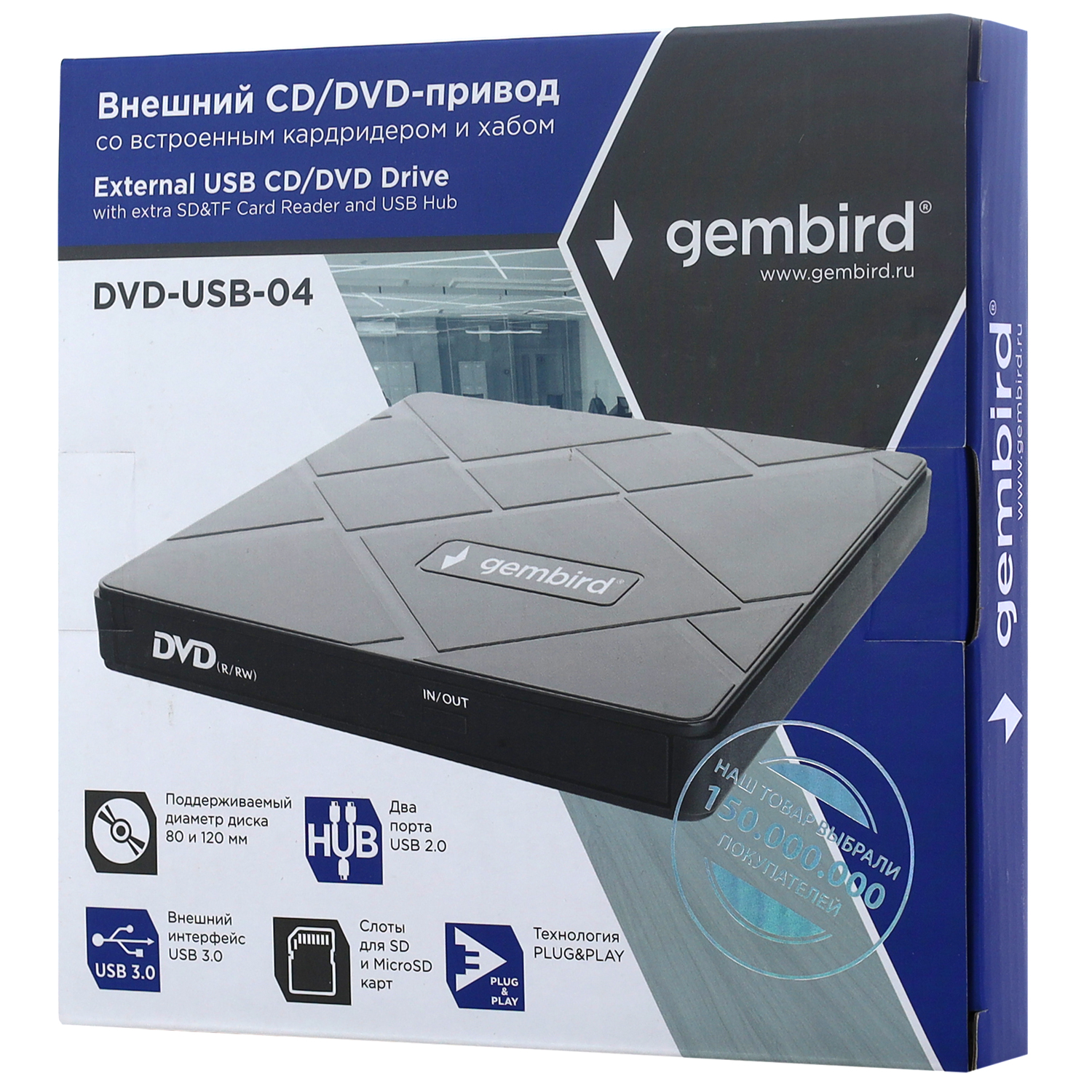 Внешний оптический привод Gembird DVD-USB-04, Черный Ext DVD±R/RW/-RAM,±R9, CD-R/RW, USB3.0, SD/mSD, black, box