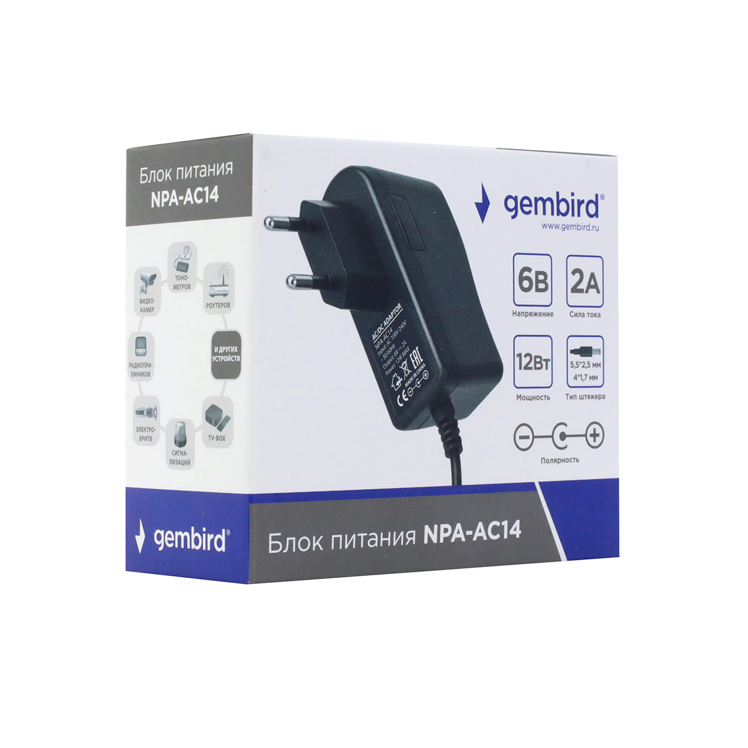Зарядка USB 220В Gembird NPA-AC14 MP3 charger, 6В/2А, 12Вт,5.5х2.5+4x1.7мм, Black